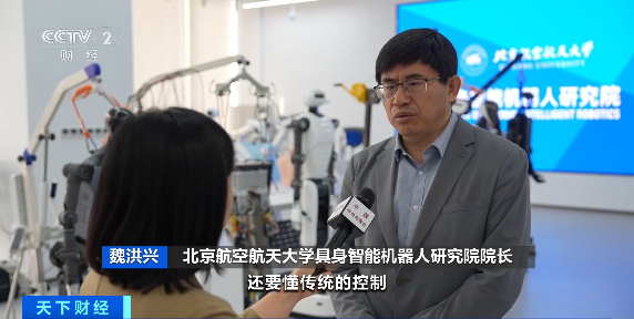 北京航空航天大学具身智能机器人研究院院长 魏洪兴:具身智能既要懂人工智能、懂机器人,还要懂传统的控制。目前这个产业发展太快了,这种通识人才非常缺乏。我们是第一年招生,有30个指标,北航的专业就是围绕飞机制造来设计的,它很多需求是柔性制造,需要人形机器人,我们的学生后续就在这些未来应用方面发挥很重要的作用。