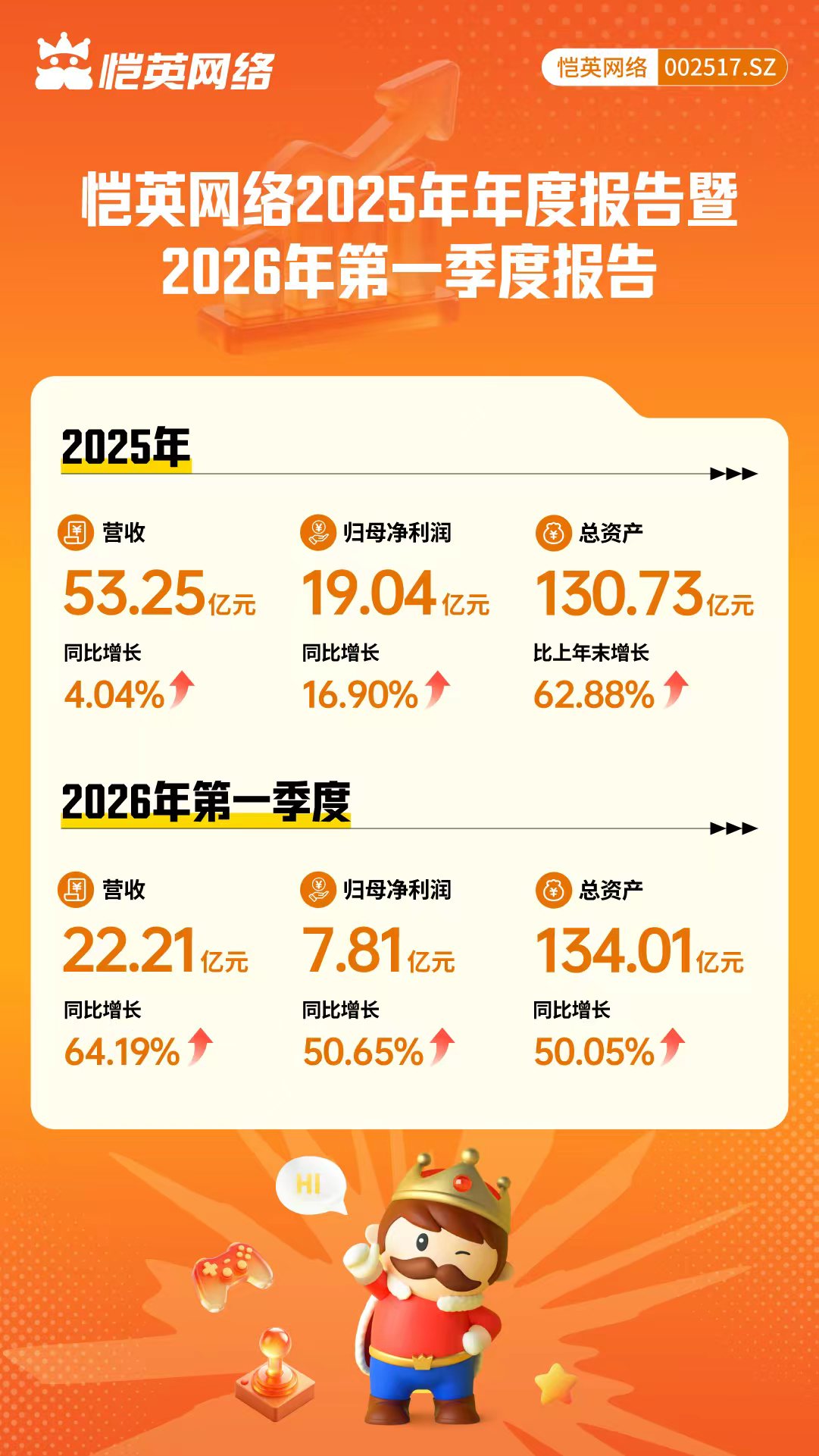4月28日晚,恺英网络(002517.SZ)发布2025年年度报告及2026年一季度报告。数据显示,公司2025年实现营业收入53.25亿元,同比增长4.04%;归属于上市公司股东的净利润19.04亿元,同比增长16.90%。2026年一季度,公司实现营业收入22.21亿元,同比增长64.19%,归母净利润7.81亿元,同比增长50.65%。从年报披露来看,面对内外部环境的深刻变化,公司AI方面的布局引人注目。