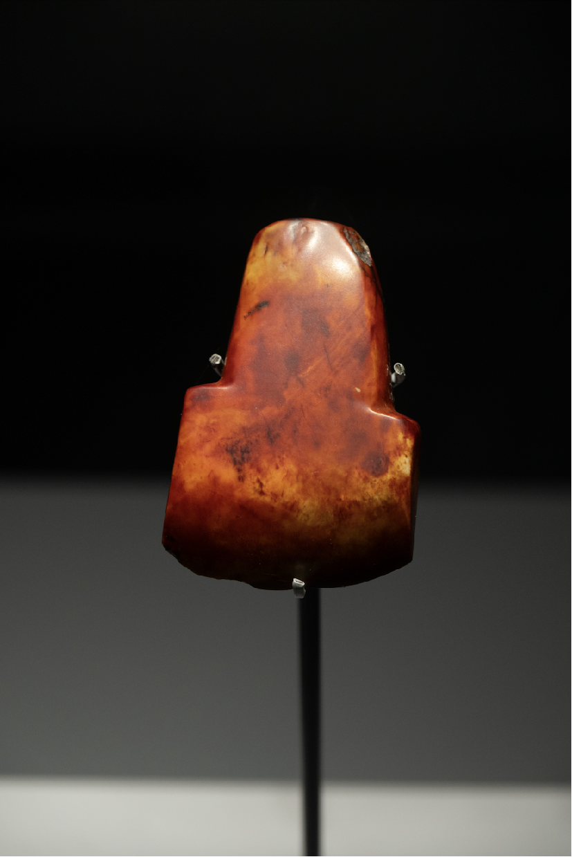 这件石锛为双平肩设计,色泽红润,通体精磨后兼具玉的温润质感,被誉为贵州发现的最精美双肩石锛之一。