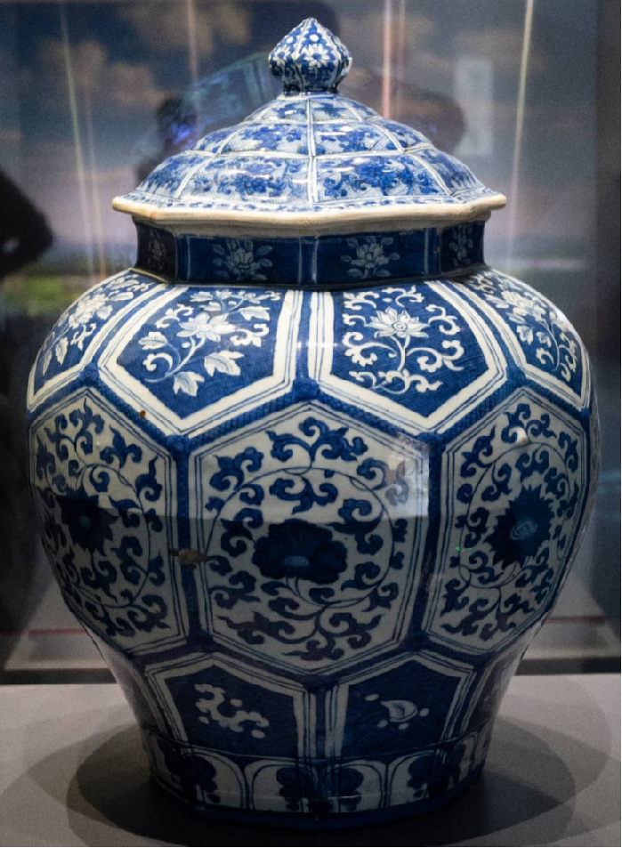 该罐八方形直口、鼓腹带盖,胎质细腻。罐身分层绘缠枝花卉、莲瓣、海兽杂宝等纹样。器底青花楷书“万历丁亥年造黔府应用”十字款,纪年与用途清晰可考。是国内现存唯一带明确年款的大型黔府定制青花罐。