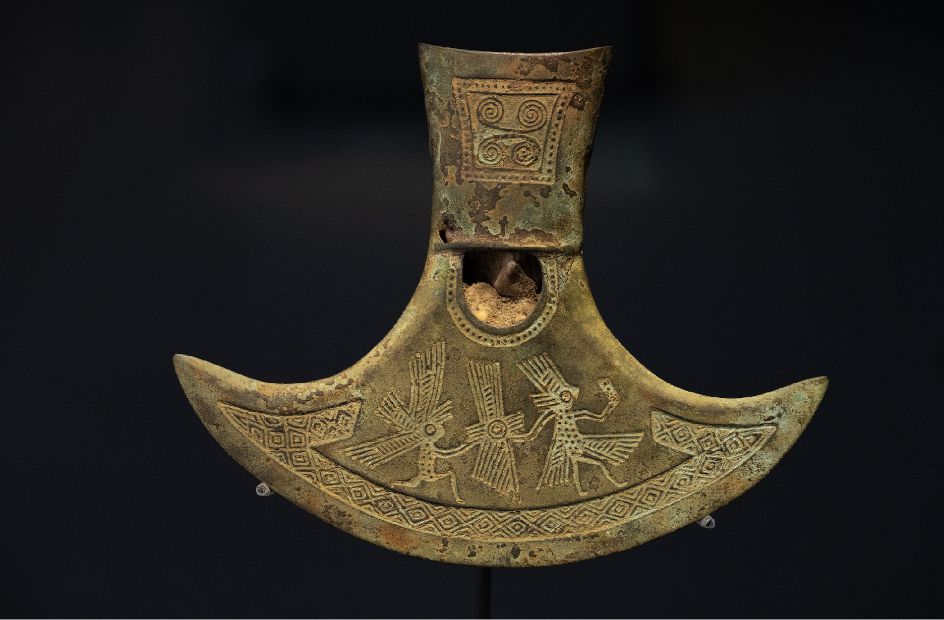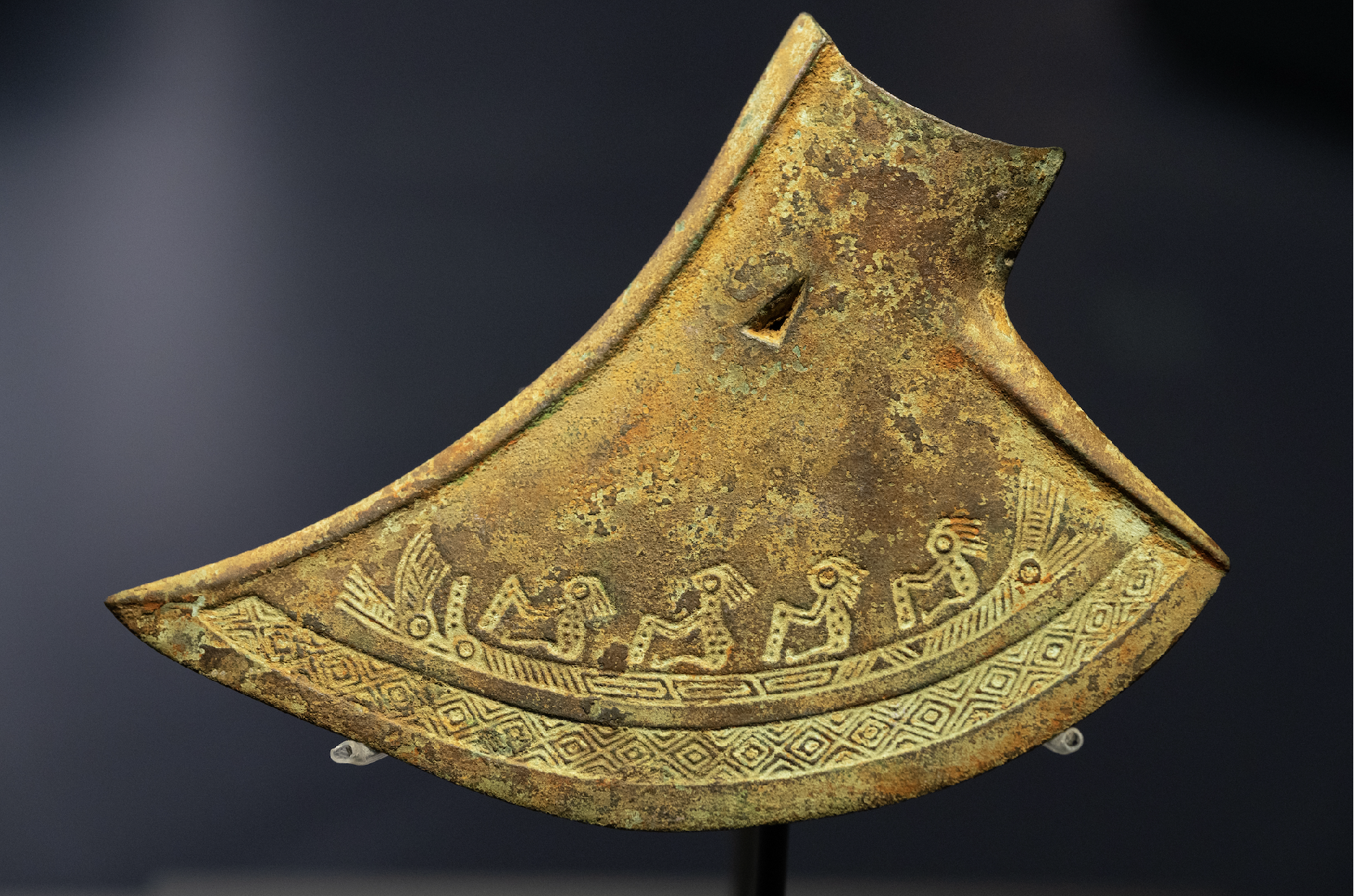 这种铜钺在同类器物中尤为少见——两侧刃部弧度明显不对称,这并非制作粗糙所致,而是西南青铜文化的一种特有形制,且与越南东山文化器物高度相似。中原铜钺讲究对称规整,西南各族的铜钺则常有异形变体,折射出山地族群与中原礼器系统之间既有交流、又保有自身传统的复杂关系,也见证了战国时期西南边疆与东南亚地区的文化交流。