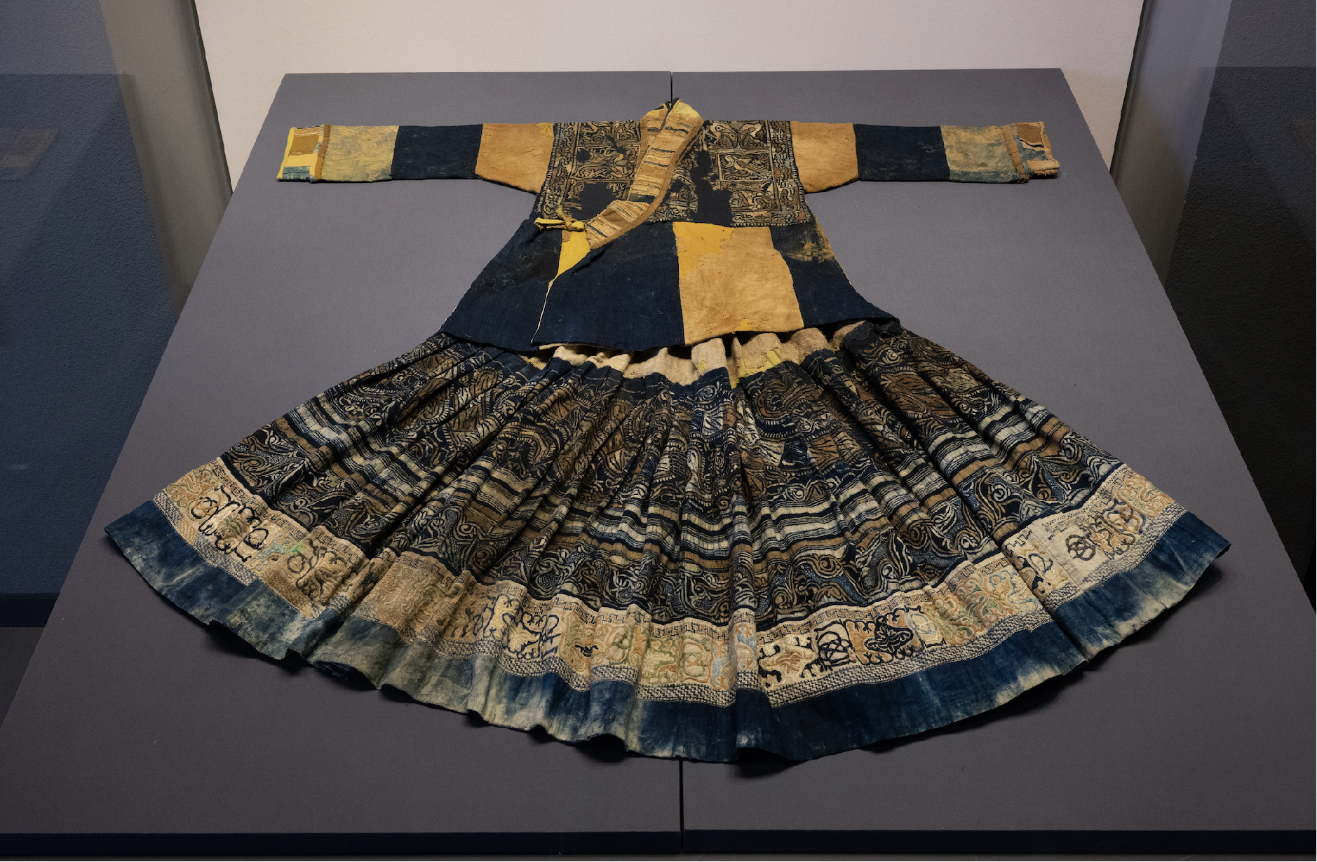 1987年出土于贵州安顺平坝桃花村苗族洞葬第415号棺,为明代苗族女性的盛装。是我国现存最早、保存最完整的古代彩色蜡染实物之一。明代,随着卫所移民的迁入,棉花种植技术传入贵州,逐渐在黔中、黔西地区普及,为当地染织服饰提供了充足原料,推动了西南少数民族染织工艺的发展。