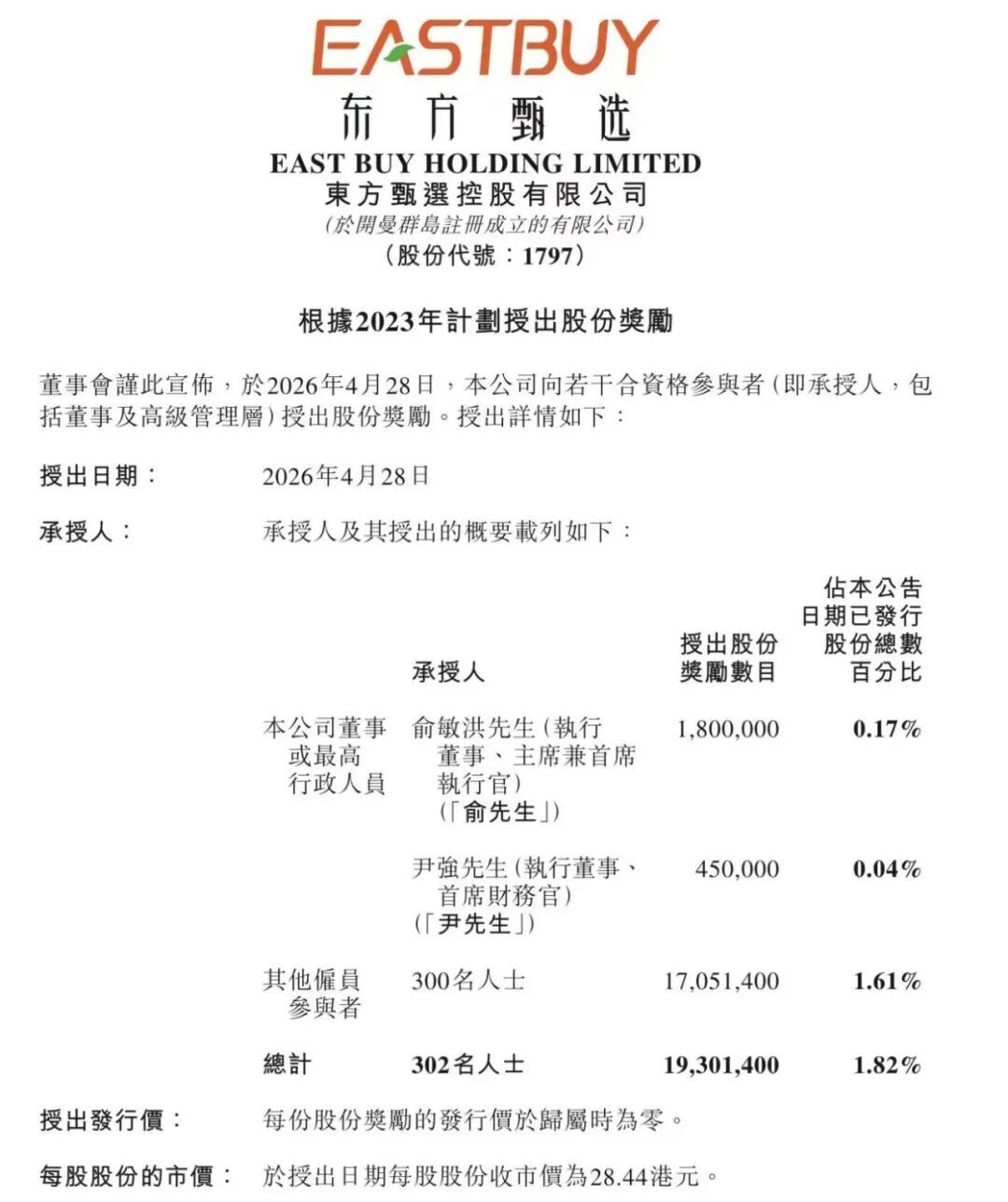 经济观察网 东方甄选(01797.HK)4月28日晚间发布公告,依据2023年股份激励计划,向公司董事、高管及核心员工授出1930.14万股股份奖励,涉及302人,占已发行股份1.82%,当日收盘价28.44港元/股。