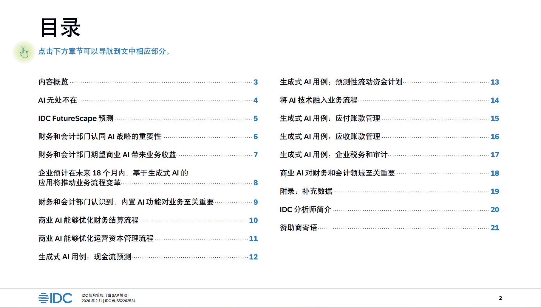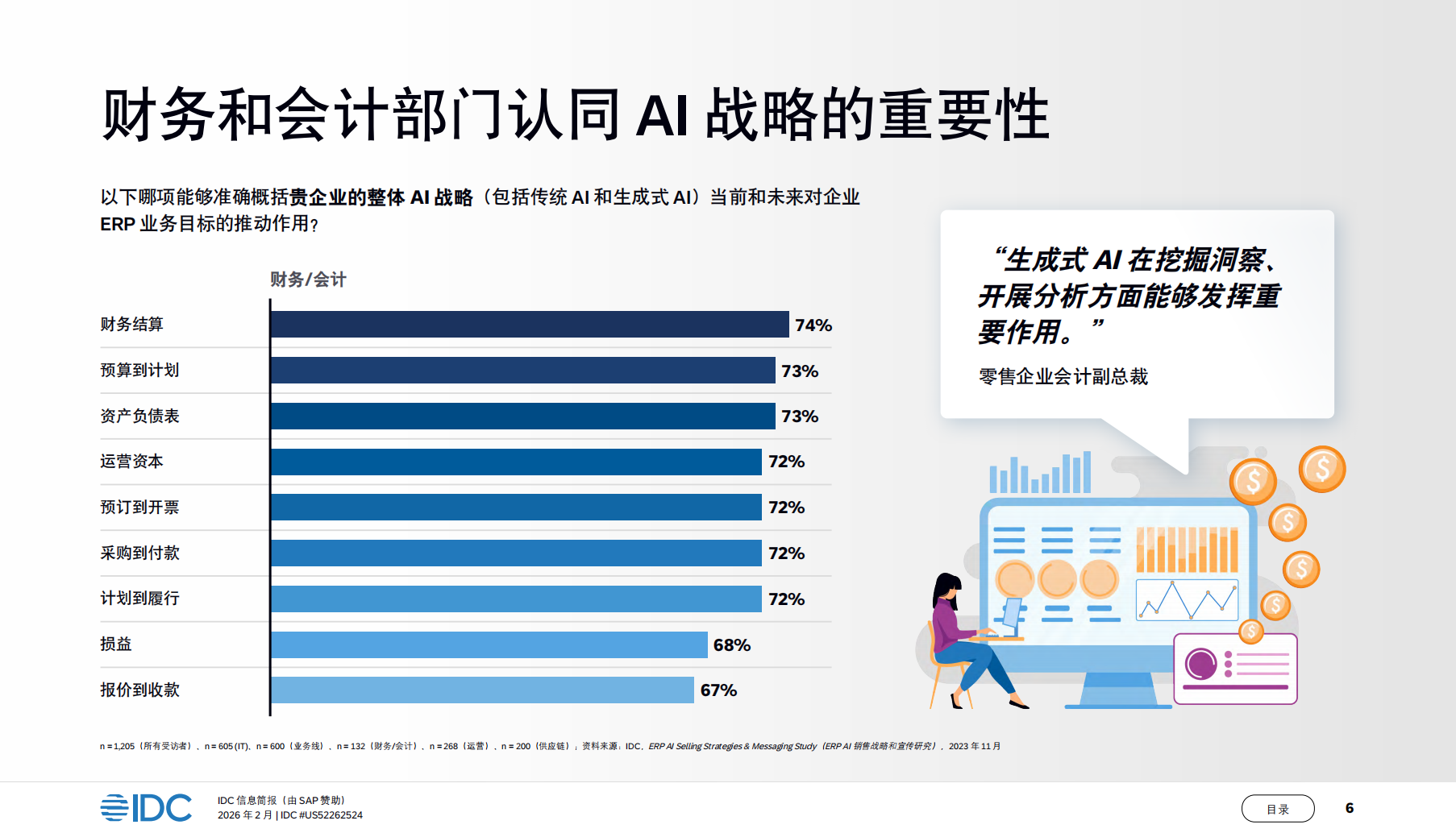 AI正在彻底改变财务与会计领域的运作方式。根据IDC的最新调研,全球企业正加速将预测式AI、规范式AI和生成式AI融入核心财务流程。商业AI不仅能显著提升财务结算效率、优化运营资本管理,还能实现更精准的现金流预测和流动资金计划。与此同时,越来越多的企业将借助内置AI的应用从“记录系统”转向“智能计划系统”,从而获得更出色的业务成果。财务部门对此期望明确:提高生产效率、加速决策、生成实时洞察。无论是应付账款、应收账款,还是企业税务与审计,生成式AI都已展现出强大的变革潜力。