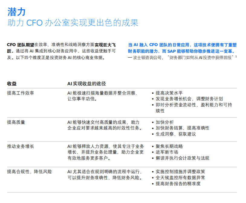 因此,SAP 正在将先进的 AI 功能深度整合至我们的 ERP 云解决方案中。我们的目标是赋能财务专业人员,为其提供具有情境感知能力的智能决策支持;我们的愿景是借助AI 推动财务转型。采用 SAP 的解决方案及其中嵌入的 AI 功能,CFO 团队不仅能精简财务运营,还能从内部服务提供者转型成为驱动企业成功的战略合作伙伴。