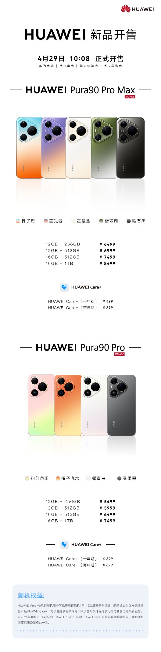 4月29日,华为Pura 90系列正式开售,包括华为Pura 90 Pro和华为Pura 90 Pro Max,起售价分别为5499元和6499元,定价均低于上一代对应型号。作为全新一代先锋影像美学旗舰,华为Pura 90系列最大的创新,是在硬件与算法趋于同质化的行业背景下,凭借首发 XMAGE 智拍系统,引领移动影像迈入全新的智慧拍摄时代。