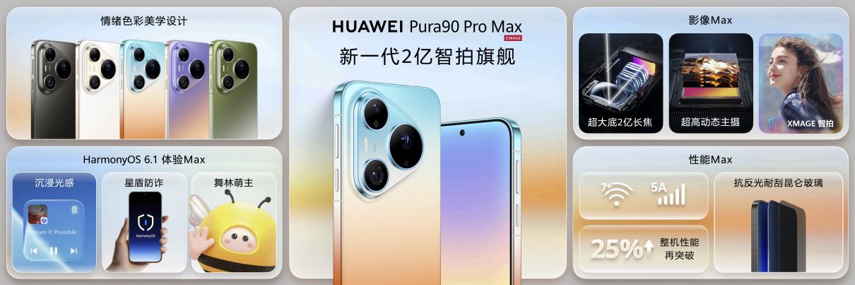 设计是这一代产品的另一个亮点。华为Pura 90系列首次引入情绪美学设计,华为Pura 90 Pro与华为Pura 90 Pro Max,共有7款渐变配色,其中橘子海和翡翠湖的金属中框双色渐变工艺,实现从玻璃背板到金属中框的渐变色自然过渡,整机质感提升显著。