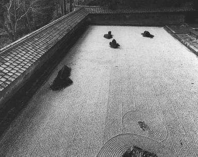 日本的“枯山水”最具代表性的当属京都的龙安寺石庭,它建造于室町时代末期。那里没有一草一木,在屋前一块约一百坪的长方形空地上平整地铺上白色的砂粒,砂粒上描划出水的波纹,十五个大小不一的岩石不规则地排列在白砂之中。其景观有点像浮出海面的岛屿,从前人们称这座庭园为“虎子渡水庭”,传说它反映的是几只小老虎在父母的带领下渡水的情景。