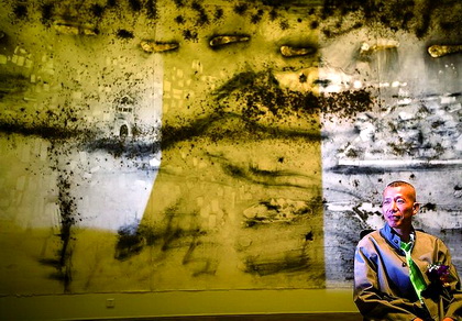 对艺术圈内的人来说,蔡国强的作品耳熟能详,更多人是带着看热闹的心情来见证回顾展的开幕式,但是当他们进入中国美术馆,仍然可以感受到蔡特有的爆炸般的气势:占据中央展厅整面墙壁的是他一周前刚刚创作的火药画《历史足迹:为北京奥运作的计划》,这是对他设计的奥运会开幕式29个焰火脚印从永定门走进 “鸟巢”的宏伟场景的再现,但彩色已经化为浓厚的黑黄色印记,灼烧形成的斑驳脚印穿越模糊的人民大会堂、天坛、“鸟巢”等标志性建筑,如同一个轻盈的梦掠过这个古老的城市。