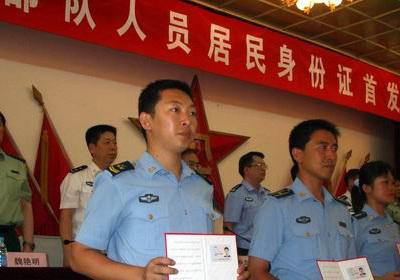 在由军队和北京市公安局、北京卫戍区联合举行的首发式上,驻京部队的460多名官兵领取了中华人民共和国居民身份证。首批领取居民身份证的有北京卫戍区某警卫师炮兵团、北京军区空军某基地、武警北京总队某支队的官兵。