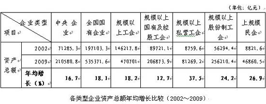 3、从资产总额看:国有企业资产总额较大,民营企业资产总额增加速度较快。私营工业企业资产总额不及国有及国有控股工业企业的一半,但加上股份制企业中的私营控股企业,全部私营及私营控股企业资产总额可能已与国有及国有控股工业基本相当。