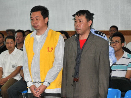 8月6日,被告人李东明(前右)、苏绍录(前左)在嵩明县法院受审。