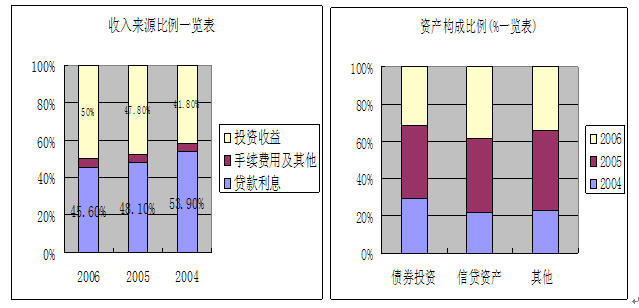 该行利润构成的主要特点是投资收益较大,2006年投资收益占比50%。公司债券业务规模较大,资产负债管理期限匹配基础较好,资金使用效率和头寸运用较好;但是公司盈利水平受利率波动和的影响较大,市场风险管理任重道远。值得注意的是,2006年度利率持续上升,导致该行债券收益率下降,债券投资收益主要靠规模扩张。