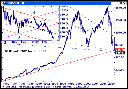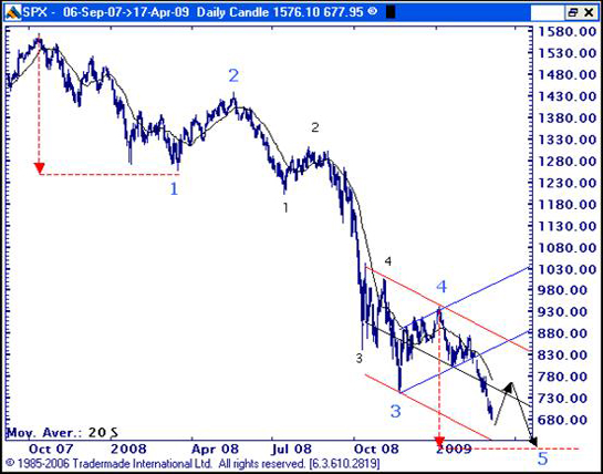 不幸的是,如果这种预测被证实是正确的,那么之后市场还会进一步下跌。具体来说,如果一个驱动浪的第3浪细分成一个延长的5浪结构,正如从08年5月至08年11月期间市场走势那样,则第5浪往往等于第1浪。基于此,以及标普500指数自08年10月后下降通道的支撑线(见下图红线),则根据技术分析理论,意味着08年10月之后的指数走势已经达到了完成的要求。这个波浪结构可能会在哪里,在什么时候结束呢?指数大概是在650至624点附近,时间大约在4月中旬。