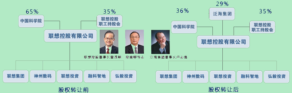 引入中国泛海后,联想控股原股权结构为:国科控股占65%,联想控股职工持股会占35%。此次股权转让后,联想控股新的股权结构为:国科控股占36%,仍为联想控股第一大股东,联想控股职工持股会占35%,中国泛海占29%。