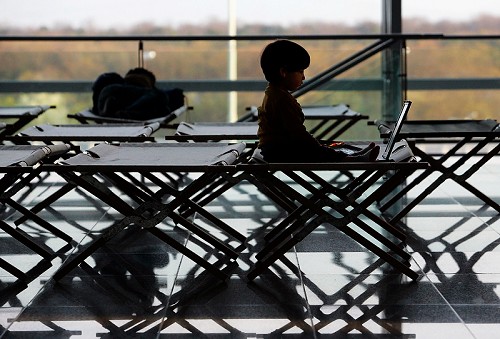 一个在用笔记本电脑的小孩坐在机场提供的折叠床上。 德国,法兰克福机场 图片来源:网络