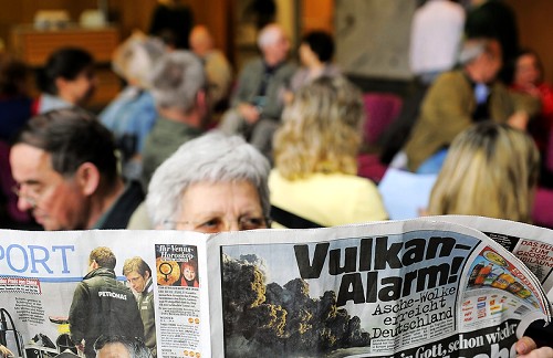 一位女士在等待航线恢复正常时看一份以火山新闻为头条的报纸。 德国,爱尔福特机场 图片来源:网络