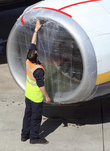 地勤人员吧塑料罩盖在飞机的发动机上。 英国,贝尔法斯特机场 图片来源:网络