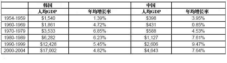 韩国人均GDP的增长率在上世纪70年代到达峰值,数值为6.85%。其人均GDP在1970年代为3533美元。此后,韩国每十年的增长率一直在下降。与此同时,如果按相同的发展阶段进行比较,中国的增长速度远超过韩国。在1990年代,中国的人均收入为2606美元,年均增长速度为9.47%。而从2000年至2004年,中国人均收入增长率降至7.64%;但随着名义GDP的上升,人均GDP在未来几年仍有望反弹。