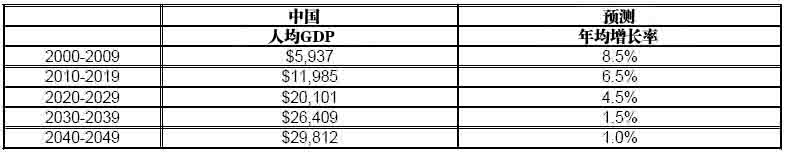 从历史经验中,我们可以预测中国未来的经济增长速度。从1980年到1989年,美国人均GDP增长率为2.1%,到1989年达到了26982美元。日本和德国更是与中国相似。到2020年,中国的人口状况将更类似于上述两个国家,而从2030年开始,这种人口结构将不利于经济增长。和中国一样,日本和德国的经济也高度依赖制造业的出口。日本人均产出率在2000至2004年增长0.8%,达到24660美元。而德国人均产出率每年增长0.5%,2004年达到25610美元。据此,中国到2050年时的人均GDP数字预测值如下: