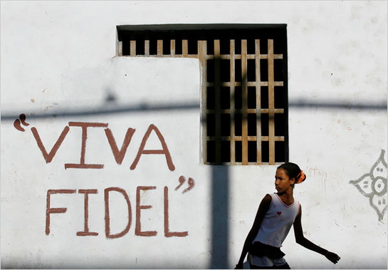 古巴即将迎来五十周年庆典,一个女孩在写有“菲德尔万岁!”的墙前走过。