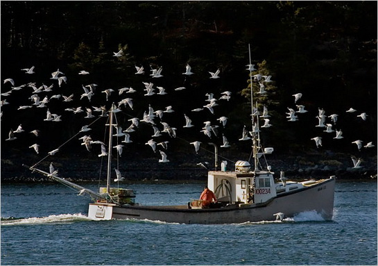 加拿大海边的捕虾船,捕虾者们正享受着惬意的天气,龙虾的价格却下跌了。