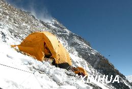 (5月8日凌晨,北京奥运圣火珠峰传递登山队从海拔8300米的突击营地出发,向着珠峰峰顶冲击。这是出发前的珠峰8300米突击营地。)