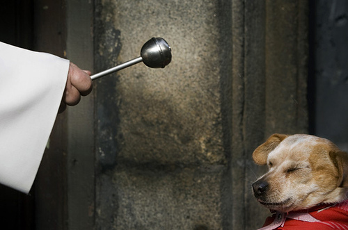上帝保佑你。在马德里的祝福狗节日里,神父 Juan Manuel Villar 正给一只虔诚的狗祝福