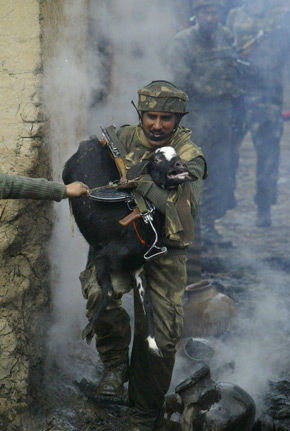印度陆军士兵营救在 Chewdara 枪战中被困的山羊