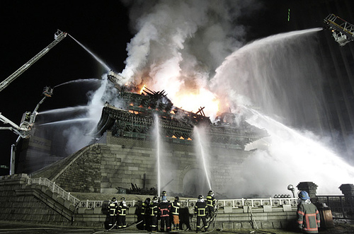 消防队员扑灭韩国首尔头号国宝崇礼门的大火