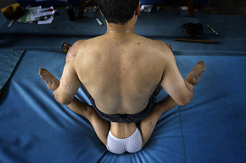 北京体育训练中心,体操教练帮助年轻的运动员练习身体灵活性