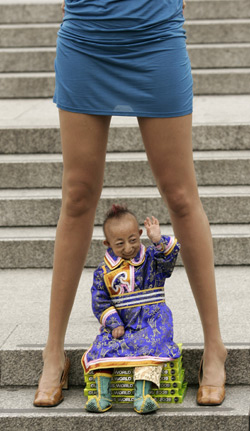 在伦敦 Trafalgar 广场,来自内蒙古的世界最矮男子和来自俄罗斯的世界最高的女人