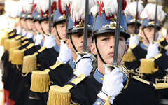 当飞机通过协和广场的总统阅兵台上空后,陆海军分列式开始向总统敬礼。