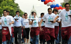 图为美国华盛顿宾夕法尼亚大道上,庆祝法国国庆的趣味赛跑比赛。