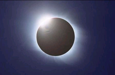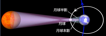 日全食原理:日全食必须太阳、月亮、地球在一条直线的时才能发生。同时,月亮还必须在新生相的位置。在日全食的时候,月亮在地球的影子分为两部分,中心的地区叫做本影,外面的区域叫做半影。只有处在本影的位置才能看到日全食。