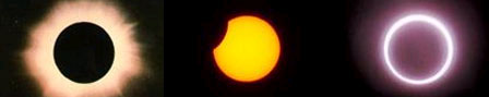 日食类型(从左至右):日全食:观测者处于本影范围内,整个太阳将会被遮住;日偏食:观测者处于半影范围内,只能看到日轮的一部分缺失;日环食:月球位于公转轨道中离地球较远的位置,观测者看到太阳变成圆环。