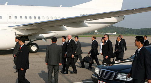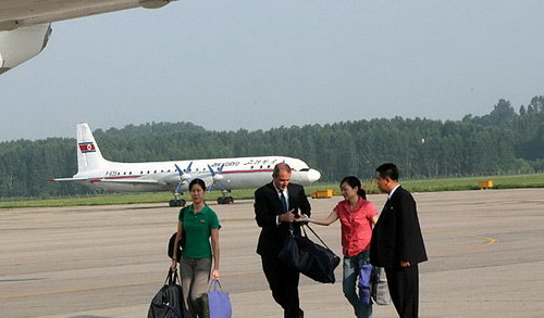 8月5日,美国前总统克林顿(左五)准备乘专机离开朝鲜首都平壤。新华社/图