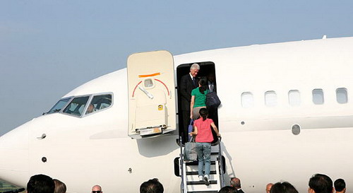 被释放的两名美国女记者搭乘美国前总统克林顿的专机离开朝鲜首都平壤。新华社/图