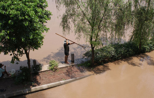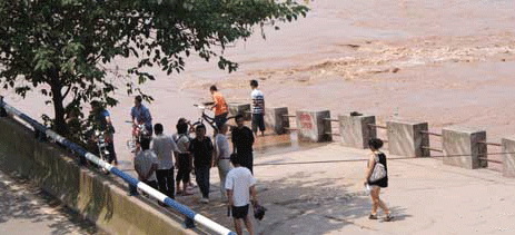 7月20日中午,趁着洪水摸鱼的重庆市民 记者 张晓晖/摄