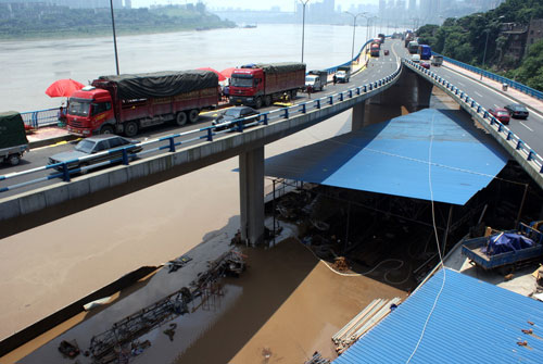 7月20日,重庆长江菜袁路高架桥下的洪水 记者 张晓晖/摄