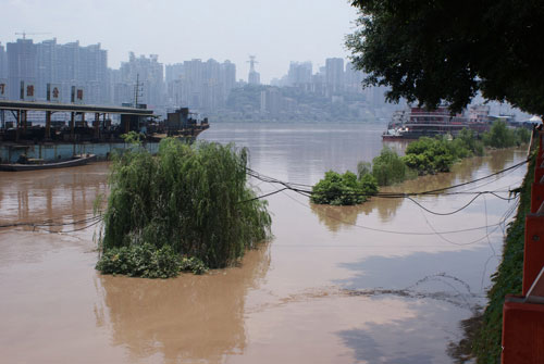 朝天门滨江路上被淹没的柳树 记者 张晓晖/摄
