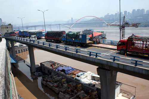 7月20日中午,重庆菜园坝淹没区内的大货车已经尽数上岸,临时停靠路边 记者 张晓晖/摄