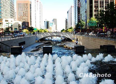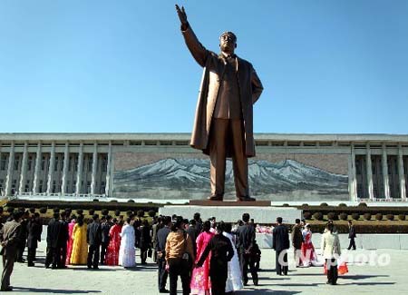 图为朝鲜平壤祖国战争胜利纪念塔广场、平壤万寿台金日成铜像、清溪川水边空间的瀑布、首尔的夜市-酒巴一条街。(图片来源:CNS)