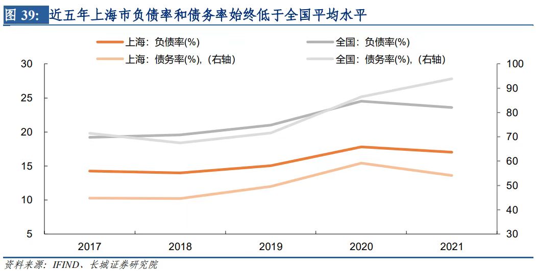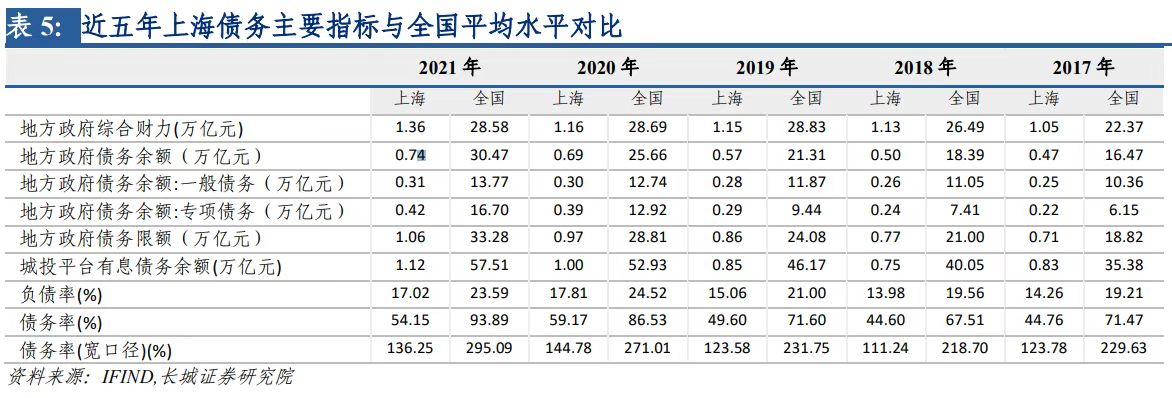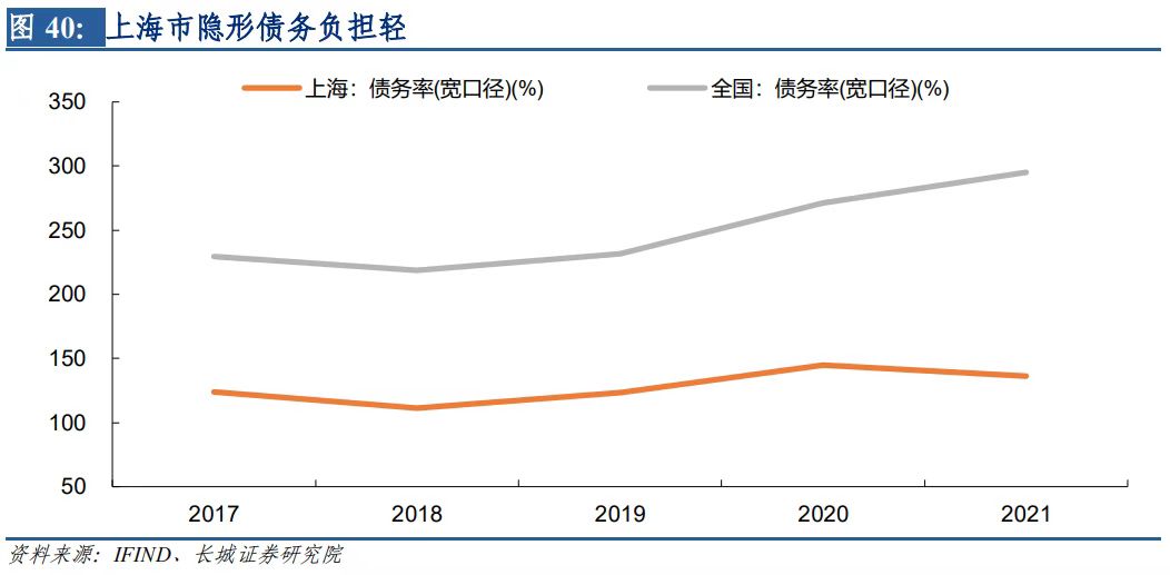 将城投债余额也纳入债务后,上海市宽口径债务率仍处于低水平。近五年,上海市宽口径债务率的复合年增长率为1.91%,基本保持稳定,且始终远低于全国平均水平,反映出上海市隐性债务负担较轻。2021年上海市宽口径债务率为136.25%,显著低于全国各省平均水平(292.85%)。