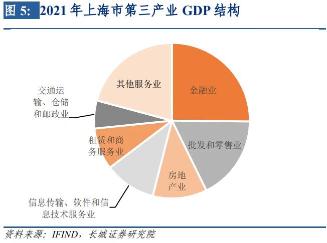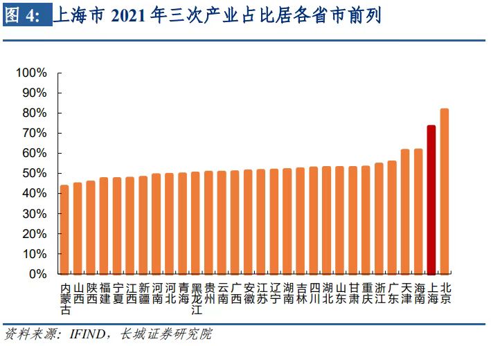 2021年上海市三次产业占比为0.2:26.5:73.3,相比于全国三次产业比重的7.3:39.4:53.3,上海市第三产业占比明显较高。从上海市统计局公布的数据来看,2021年上海市地区生产总值43214.85亿元,按可比价格计算,比上年增长8.1%。其中,第三产业增加值首次突破3万亿元,达31665.56亿元,同比增长7.6%,占GDP比重为73.3%,三产占比位列全国第二,服务业已成为上海经济增量的主导引擎,对经济的拉动作用明显。