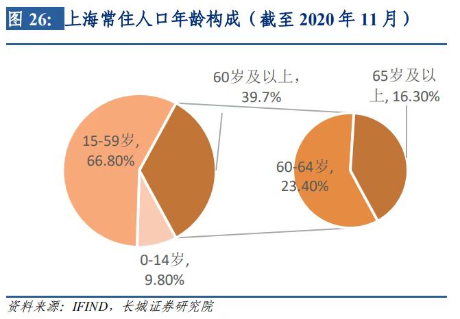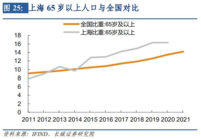 从常住人口年龄结构来看,人口老龄化是上海目前面临较严峻的问题。上海65岁及以上人口比例从2012年的9.4 %到2020年的16.3%,整体呈现明显的上升趋势,并且持续高于全国平均水平。按照65岁以上人口占比14%即进入深度老龄社会的国际标准,上海已于2021年末进入深度老龄化阶段。