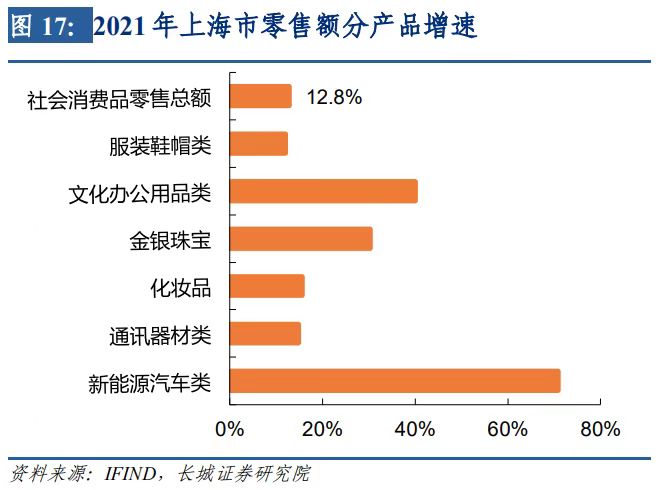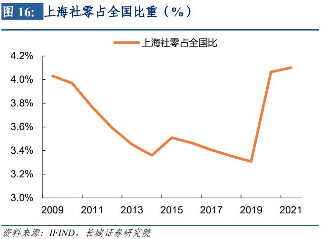 消费方面看,上海社会消费品零售总额快速增长,消费结构持续改善。2012年到2021年上海市社会消费品零售总额复合增速为10.5%,高于同期全国平均水平(8.9%)。从2020年开始上海社会零售总额占全国比重显著抬升,这主要是因为全国消费受疫情影响有所下降,但是上海市在新能源汽车、线上生鲜消费等领域的拉动下社会零售总额依旧保持增长。2021年,上海市社会消费品零售总额达1.8万亿元,比上年增长13.5%,居全国城市第一。其中与消费升级相关的商品消费增势良好,金银珠宝、化妆品、通讯器材类零售额分别增长30.3%、15.7%和14.8%。线上零售和民营企业销售持续增长。2021年,上海市网上商店零售额为3365.78亿元,同比增长20.8%,增速高于社会消费品零售总额7.3个百分点,占社会消费品零售总额的18.6%。民营社会消费品零售额达5471.71亿元,同比增长8.1%,占社零总额的30.3%,较上年提升了6.5个百分点。今年上半年上海消费市场受疫情冲击影响较大,但随着后续举办“五五购物节”、发放多轮电子消费券等一系列促消费政策的出台,市场销售情况有所改善。今年前三季度,上海市社会消费品零售总额达11864.63亿元,同比下降10.7%,降幅相比上半年收窄了5.4个百分点。