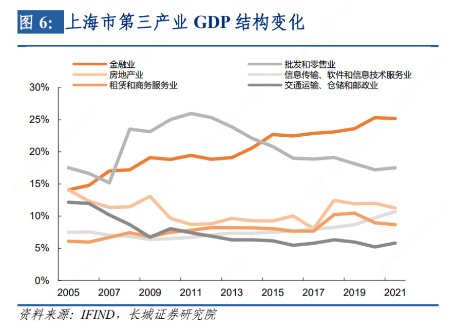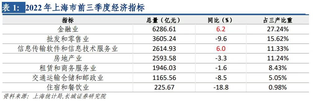 2021年上海市服务业中,金融业、批发和零售业、房地产业生产总值分别占据前三名。今年前3季度,上海市金融业、信息传输软件和信息技术服务业前三季度生产总值分别为6286.61亿元和2614.93亿元,实现6.2%和6.0%的高速增长;房地产业生产总值虽仍同比下降3.3%,但相较于前两季度,降幅有所收窄。