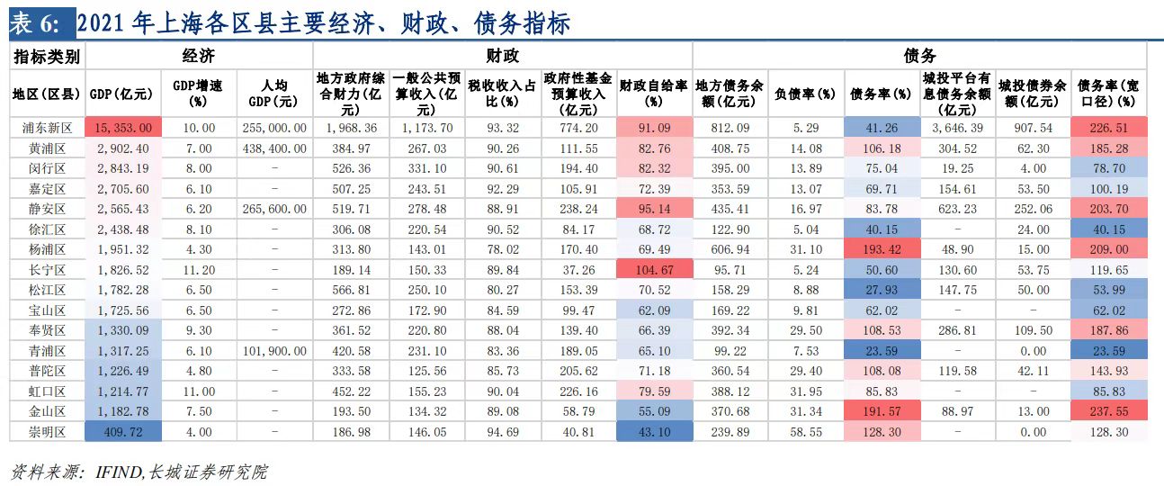 从地区结构来看,上海各区县城投债融资规模基本与其经济发展水平相一致。从2021年经济总量和综合财力看,浦东新区经济总量遥遥领先,其次是黄浦区、闵行区、嘉定区等地区。而从城投债融资规模来看,浦东区、静安区、黄浦区对资金的吸引要远超上海的其他城市。同花顺数据显示,2021年浦东新区、静安区、黄浦区三地城投平台有息债务余额分别为3646.39亿元、623.23亿元和304.52亿元。值得一提的是,金山区与杨浦区2021年无论是债务率(地方政府债务余额/综合财力)还是宽口径债务率均位于上海各区县较高水平,显示出这两地债务负担较重;另外2021年浦东新区负债率和债务率分别为5.29%和41.26%,分别处于较低和中游水平,表明浦东新区生产总值与财政实力对其债务具有良好的的覆盖能力,但将城投债纳入考量后的宽口径债务率为226.51%,排上海各区县第二位,表明浦东新区也存在较重的城投债务负担。