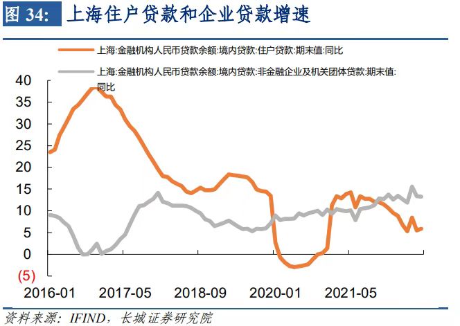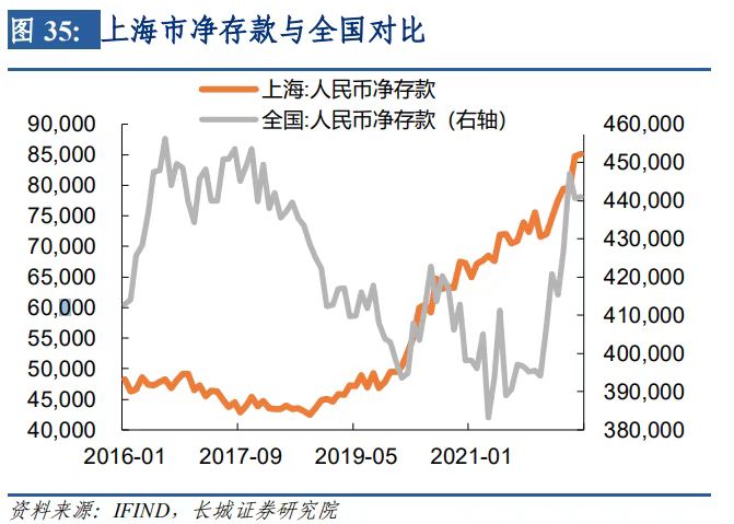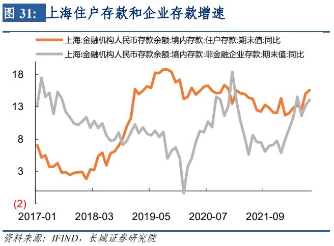 将上海人民币存款增速和全国对比后发现,2019年以来上海市人民币存款总额增速持续高于全国水平,这可能与居民存款的持续高增速和企业存款增速的上升相关。我们将存款拆分为境外存款和境内存款两大部分,其中境外存款占比自2015年以来持续高于全国同期水平,这或许与上海较强的外资吸引能力有关。如果境内存款进一步拆分,分成居民端和企业端来看,住户存款增速自2018年快速上升,之后持续高于全国水平,反映出上海居民收入高增长态势;而企业存款增速在2020年和2022年上半年有较显著的上升,也反映出疫情对上海企业的影响较为显著。